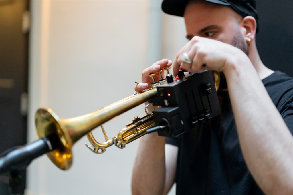 The MiBeAT (Michele Bernabei Augmented Trumpet) is a hybrid electroacoustic instrument that merges a classical trumpet with a wireless MIDI controller and light sensors, allowing the performer to shape sound, video, and lighting in real time. Designed for maximum freedom of movement, MiBeAT becomes an extension of the body, enabling a seamless dialogue between gesture and sound. Originally developed for solo performances, it has evolved into a versatile platform for audiovisual compositions, integrating environments such as Max/MSP, SuperCollider, and Resolume.